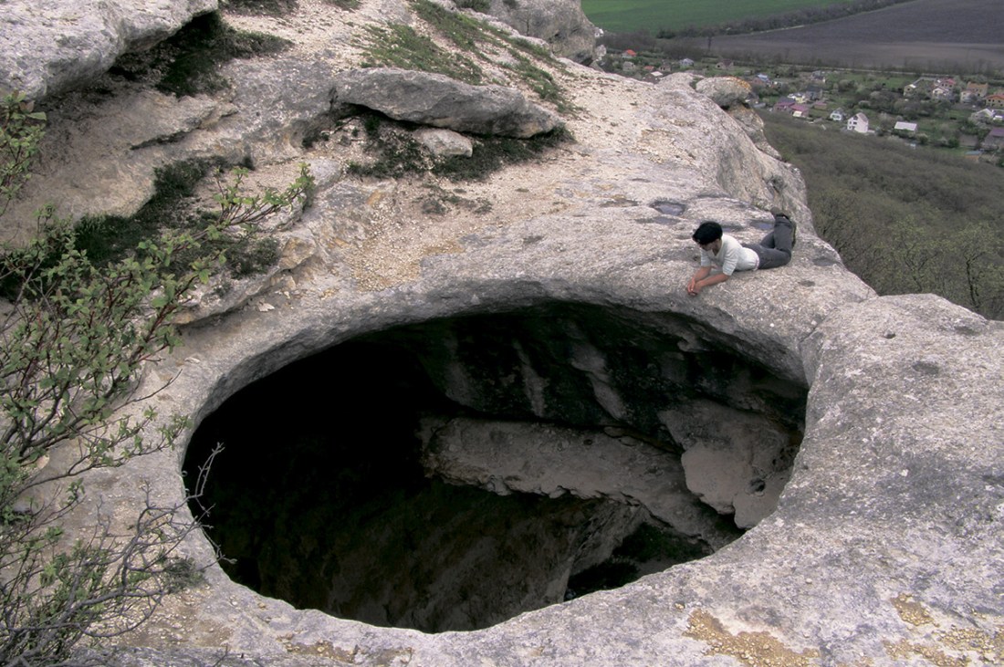 Грот Тешкли-Коба на мысе Таш-Джарган одновременно и самый внушительный среди своих собратьев, и самый доступный. Находится он всего в восьми километрах от Симферополя, недалеко от села Чистенькое. Добраться туда можно легко, без экстрима и приключений. Чуть больше часа неспешного шага требуется, чтобы дойти от села к искомой точке. Поверхность незаметно повышается, и дорога выводит на поляну, окруженную сосенками. Весной она украшена пионами и адонисами. Впереди под обрывом расстилается просторная Курцовско-Сабловская котловина. Вдоль кромки обрыва надо идти осторожно, так как «вход в преисподнюю» у ваших ног появится внезапно. Большое такое отверстие 2х3 метра, да еще и без ограждения – это и есть окно в дырявый грот.