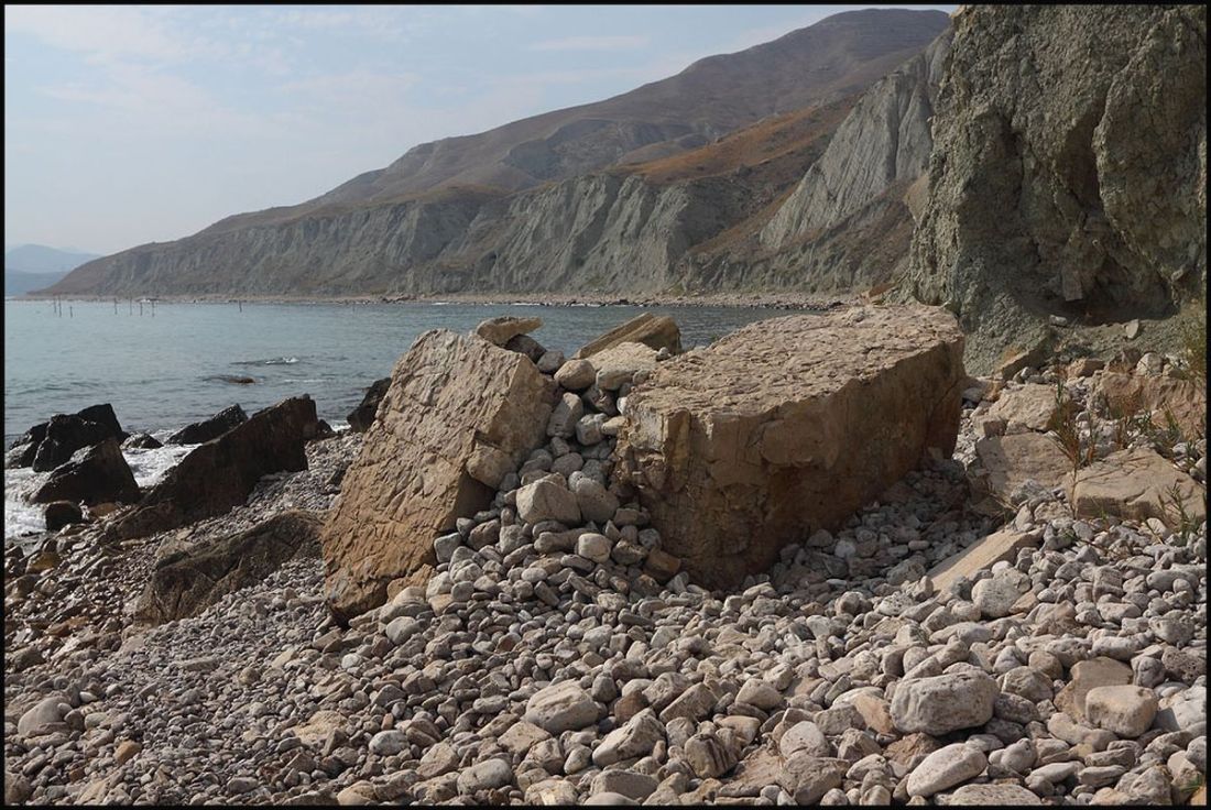 Коротко опишу характер берега. Берег есть. Изгибистый такой. И, что характерно, длинный и подло-обманчивый – каждый поворот обещает видимость цели, но, что называется, «варенье на завтра…». И до самого мыса Ильи он просто усыпан галькой всевозможных размеров, каменьями, камнями, булыжником, глыбами и просто скальными навалами вперемешку со следами глинистых оползней и осыпей.