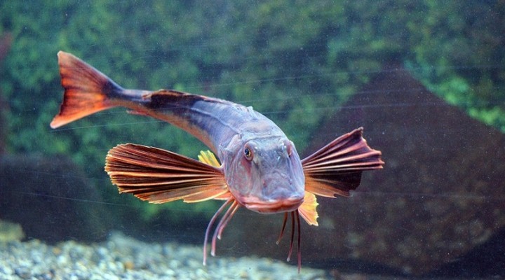 Это довольно крупная рыба с максимальной длиной тела 75 см и массой в 6 кг. Внешность у нее действительно необычная и по-петушиному яркая. Большая голова странной треугольной формы, словно панцирем покрыта прочными костными пластинами. Верхняя губа большого рта раздвоена и гламурно сложена бантиком. Длинное веретенообразное тело «одето» в мелкую чешую. Спина рыбы окрашена в разные тона – от розового до красно-коричневого. Бока золотистые или бурые, а брюшко белое. Но главное украшение морского петуха – огромные, похожие на крылья, грудные плавники. Основной их фон разных оттенков фиолетового или голубого покрыт яркими зелеными либо красными пятнами. Ну чем не петух?