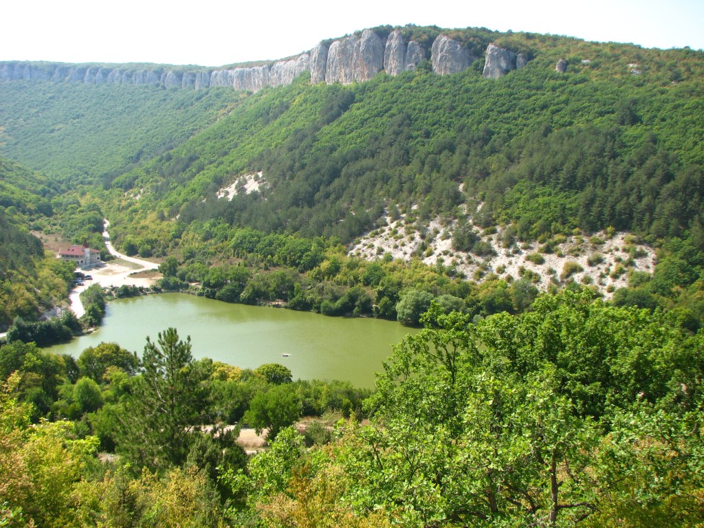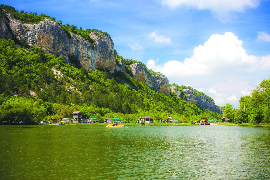 Гладь Девичьего озера, словно картина художника — приглушенная голубизна неба, насыщенная зелень поросших лесом горных куэст, светлые меловые прогалины известковых склонов и скал, отражаясь в нем словно в зеркале, придают поверхности необыкновенные бархатисто малахитовые тона.