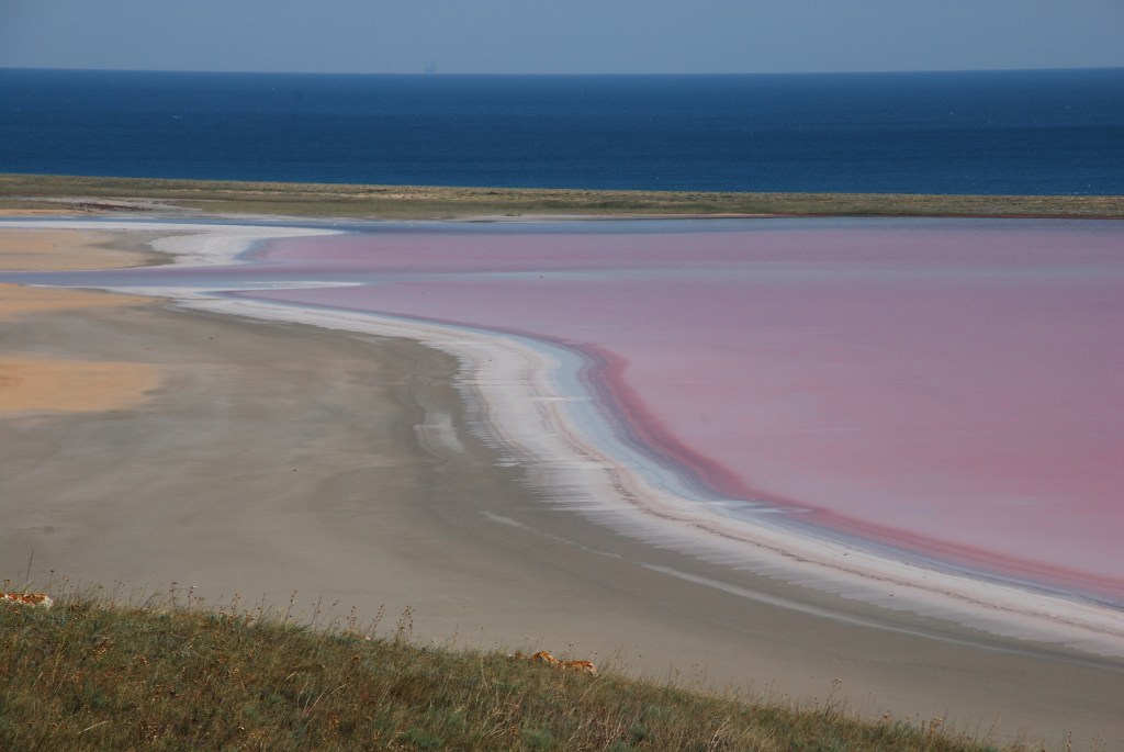 У Сасык-Сиваша пять лиманов — Караимский, Мамайский, Тюменский, Богайский, Кара-Тобекский. Удивительно то, что водоёмы подпитываются пресноводными ключами, которые бьют прямо со дна озера и лиманов! В незапамятные времена на озере гнездились огромные стаи розовых фламинго. Обширные солончаки и непролазная липкая грязь – идеальные условия для этих сказочных птиц. Увы, сейчас фламинго здесь не увидишь. Но каждое лето озеро словно бы вспоминает о них, и…само становится розовым! А к июлю-августу приобретает словно марсианские оранжево-алые цвета. Ученые объясняют розовый цвет Сасык-Сиваша прозаичным явлением: тепло и соленая вода вместе дают жизнь водоросли, богатой каротином, который окрашивает в оранжевые и красные цвета все, в чем он содержится. Фрагмент обзорной исторической статьи из выпуска №20.